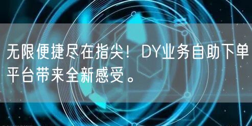 总之,DY业务自助下单平台带来了一种全新的体验,让你感受到真正的无限便捷。在这个平台上,你可以轻松完成各种业务,享受到高效、便捷、舒适的服务。快来体验吧,让无限便捷尽在指尖!