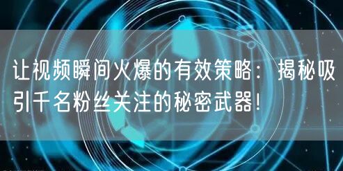 通过以上策略,我们可以让视频瞬间火爆,吸引千名粉丝关注。但最重要的是,要不断尝试、创新和学习,不断提高自己的创作能力,为观众带来更好的内容。